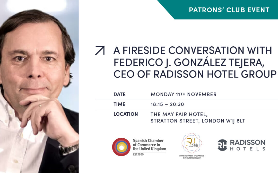 The Spanish Chamber of Commerce in the UK invites its Patrons to a special event: a fireside conversation with Federico J. González Tejera, CEO of Radisson Hotel Group and author of Living and Working Abroad: A Survival Guide.